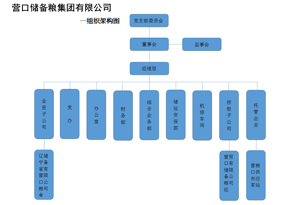 營口儲(chǔ)備糧集團(tuán)設(shè)立直屬部門8個(gè),子公司3個(gè),二級(jí)企業(yè)1個(gè)。營口儲(chǔ)備糧集團(tuán)有限公司為國有資產(chǎn)獨(dú)家持有單位,三家全資子公司為遼寧省營口糧食儲(chǔ)備有限公司、營口儲(chǔ)備糧經(jīng)貿(mào)有限公司、營口市第一糧庫米業(yè)有限公司。子公司具有法人資格,依法獨(dú)立承擔(dān)民事責(zé)任。二級(jí)企業(yè)為營口軍糧供應(yīng)站。